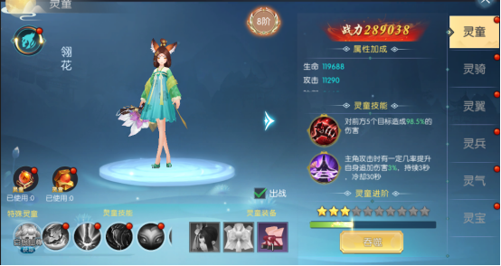 u 灵童拥有专属的两个主动技能,并且可以出战,和主角一起战斗;灵童可以吞噬多余的人物装备提升等级。