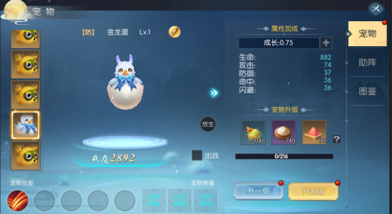 u 可通过宠物蛋获得对应不同品质的宠物;宠物可以出战跟随玩家战斗;宠物可以喂养经验道具提高等级,达到一定登记后还可以进阶变化外形;宠物可以装备专属的宠物装备,宠物装备可以通过吞噬多余的宠物装备升级;可以将闲置的宠物放置在助战位,为出战的宠物提供属性