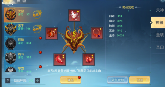 u 为神兽穿戴装备,集齐五件装备的神兽可以助战为角色提供属性;每个玩家最多有三个助战神兽
