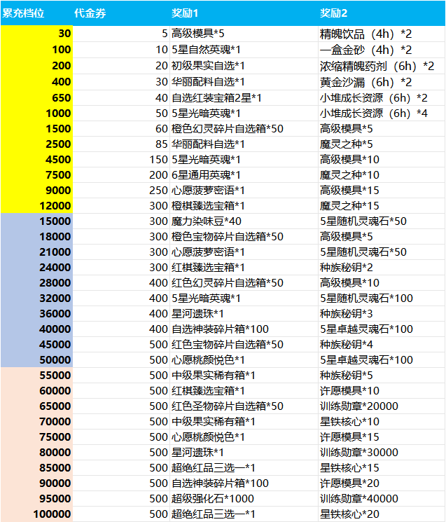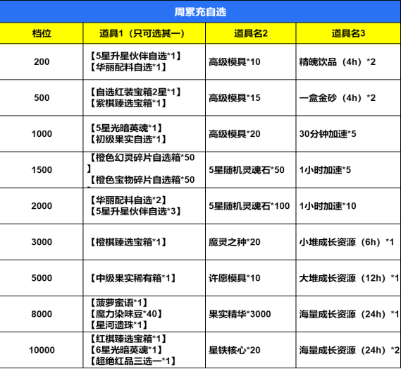 5、每个档位当周可叠加领取,即当前周累充最终金额可领取上一档全部奖励(即);