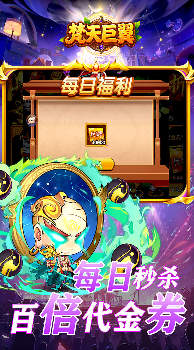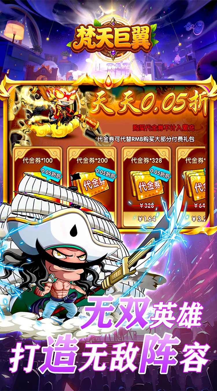 《梵天巨翼》是一款Q版国风题材的卡牌 塔防回合制游戏。你将化身主公,带领英雄们征战天下!烧脑策略秀操作,每个武将也都各具特色,趣味的玩法,休闲的画风,简单的操作,原创“满屏技能释放”,带来燃尽十足的战斗快感,每日福利拉满,永久0.05折,天天送10000代金券,让战斗在你的指尖生动重现。