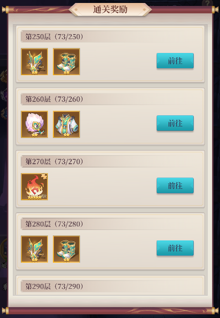 能获得武将经验、混沌精华、高级诏令等资源,如果达到相应层数,可获得首通奖励,如观星灵珠、刻印符等。