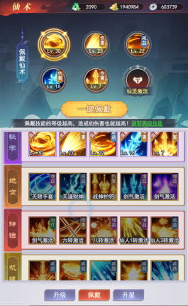 角色一共可以佩戴6个仙术技能,其中第6个仙术技能需要达到SVIP5才可以解锁,玩家可以自行搭配仙术组合,剑术升级通过剑意来提升