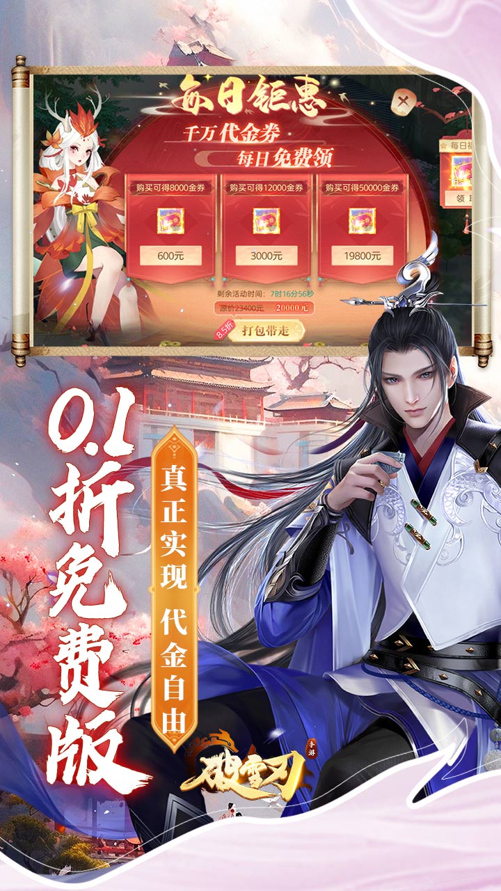 1、全新0.1折万元免费版,游戏内每日免费领10000代金! 2、礼包码wy6480专属加赠:领取进入游戏内背包每日免费开6480代金! 3、代金狂欢转盘福利:每日活跃免费再抽5000以上代金,制霸三界,指日可待! 4、进游礼包福利直送限定豪华外观,破雪春归/爱心魔毯/披紫云香! 5、代金返现再加码,福利无限升级,最高单日可返现500万无门槛代金券!