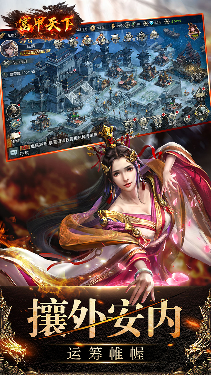 这是一款以家喻户晓的中国古代《三国》为背景的真实竞技策略手游,百城无缝大地图,真实展现了三国时期的整体图景。内政+军事+计策,带来最正统的三国玩法。游戏中您需要扮演一方诸侯,招兵买马,发展内政、扩张势力,在群雄逐鹿,豪杰辈出的三国乱世中闯荡天下!是带领忠义无双关云长、白马银枪赵子龙还是乱世奸雄曹孟德;是三国鼎立还是七雄争霸亦或十八路诸侯势均力敌!这一切都与你息息相关。