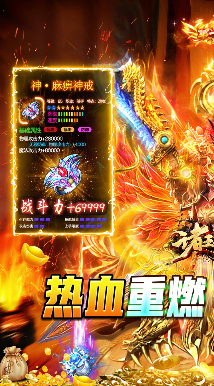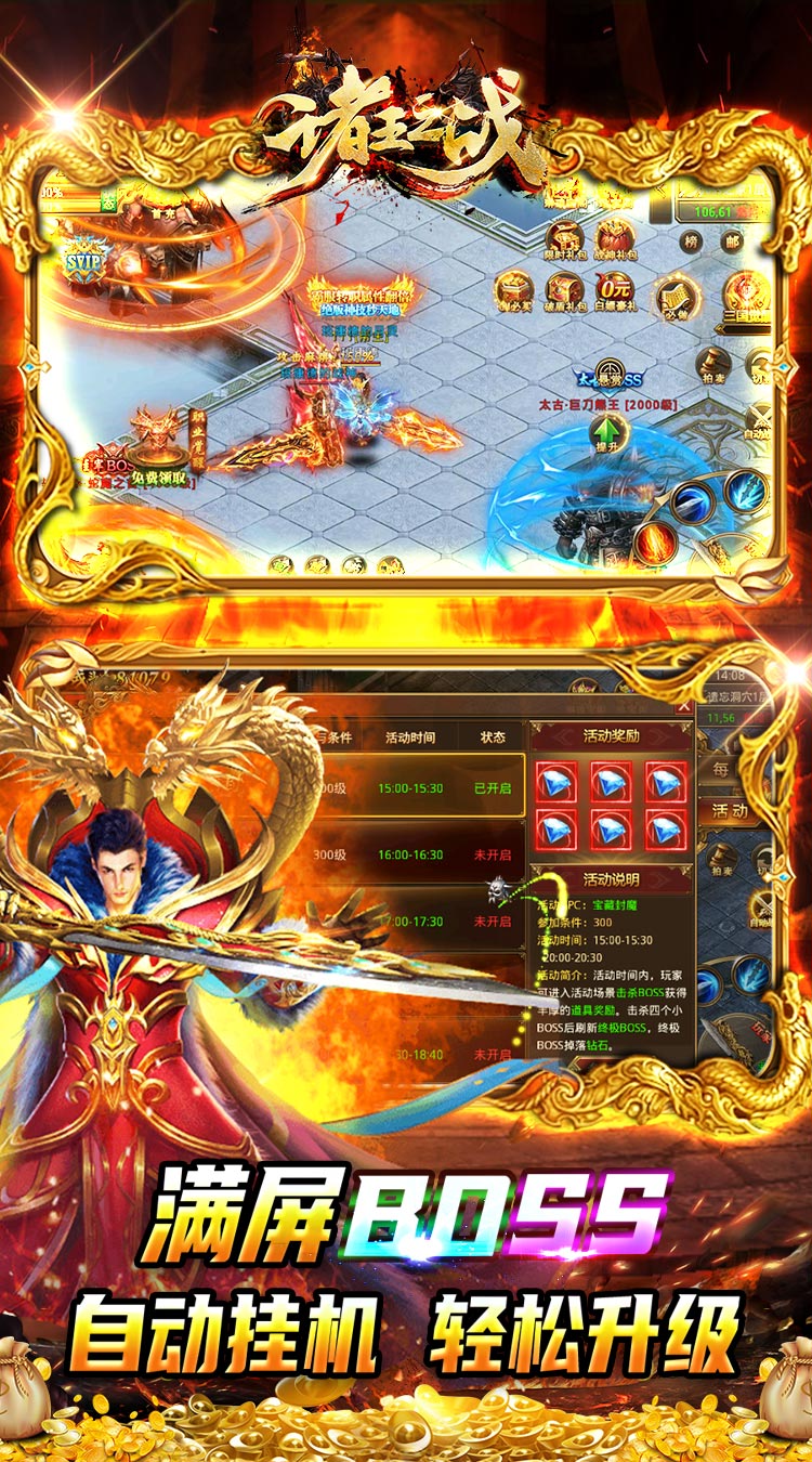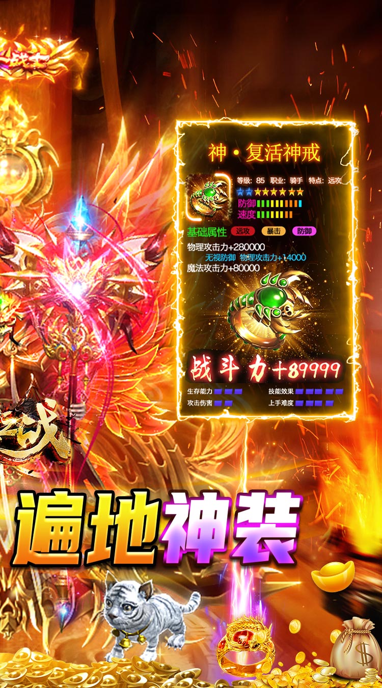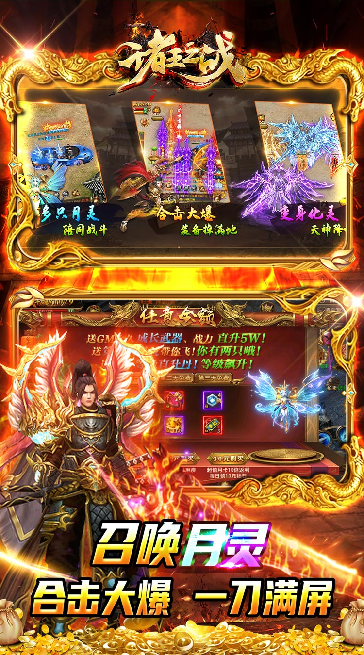 签到升级领红包,钻石送不停!完成任务免费提升SVIP等级,解锁专属地图~ 战神大礼:超前爆炸福利,战力飙升上十万!还有白嫖返利礼包,购买钻石多倍返还,切割战神免费领取! 首充首日领GM永久成长武器GM·屠龙+第二只极品月灵;次日免费领霸气战神皮肤+永久GM神甲,战力最高可破百万!第三日免费领绝版称号百分比属性+终极绝版技能,让你赢在起跑线! 热血重现,经典不灭,全场装备爆不停,升级无压力!