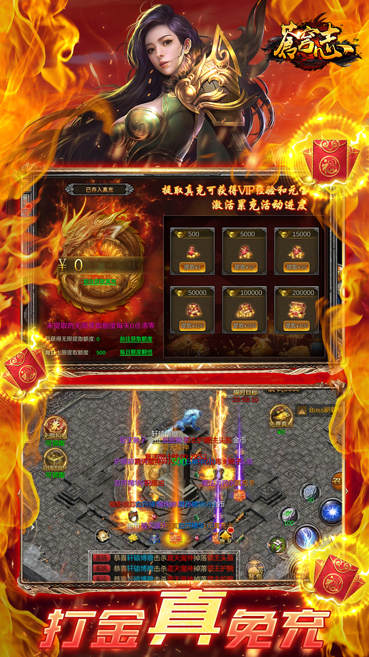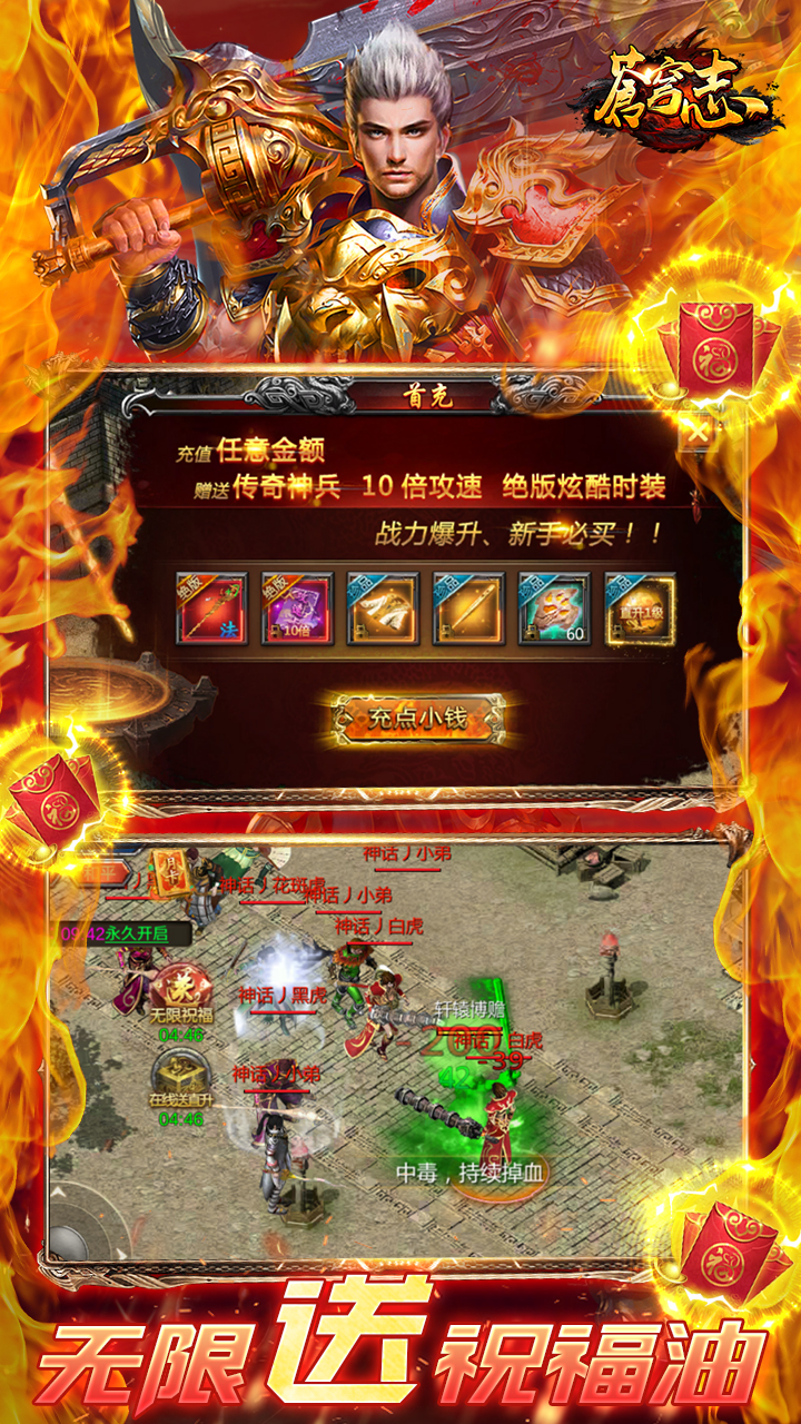 ★在线就送直升2转转生丹、vip10直升卡、海量等级直升丹、再送无限祝福油,无限点击无限领取,不收取一分钱,只怕你的背包不够,不怕送不够 ★上线送v7、元宝28888,金币8888888、全套土豪时装(体验)、真实10倍攻速(体验) ★等级直升丹天天送,坚决打假,登录次日起免费送海量等级直升丹,绝对免费送,送至满级,送至关服 ★打破传统传奇衣服武器难爆问题,做出100%掉落武器衣服boss,掉落的武器衣服还会跟随时间越来越高转数 ★首冲立送全套高战土豪时装、花开富贵脚印、过上金闪闪的土豪生活、再送真实10倍攻速永久特权、红色绝版传奇武器、等级直升丹 ★用心感受玩家的吐槽,解决没装备穿的问题,新增只属于每个玩家的专属个人高爆副本,真正高爆,真充和装备掉满地,完你大佬梦 ★免费真充,全地图boss高概率大额真充掉落,策划人格保证全地图boss,是全地图boss 都爆真充卡 ★重要的事!每天完成指定任务还能无限获得真充
