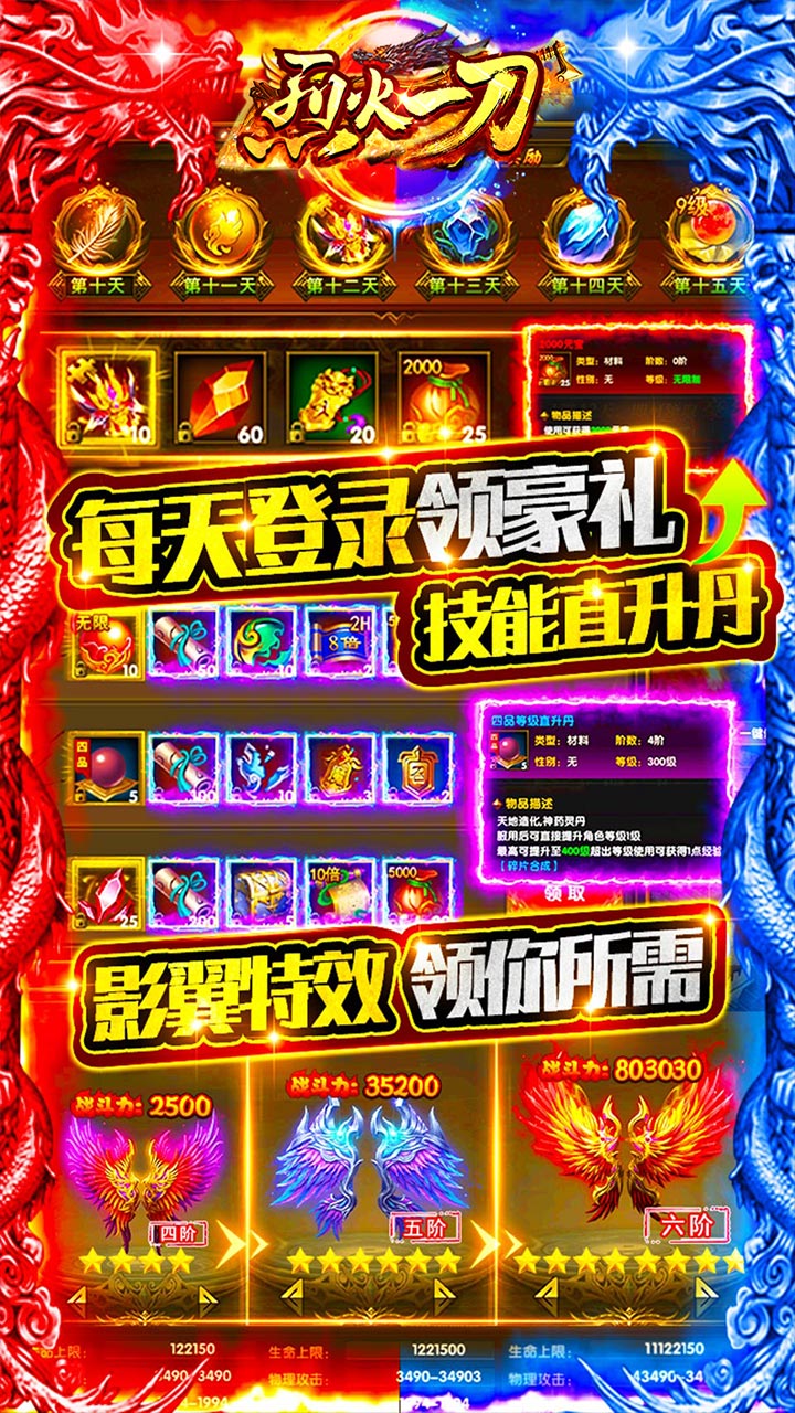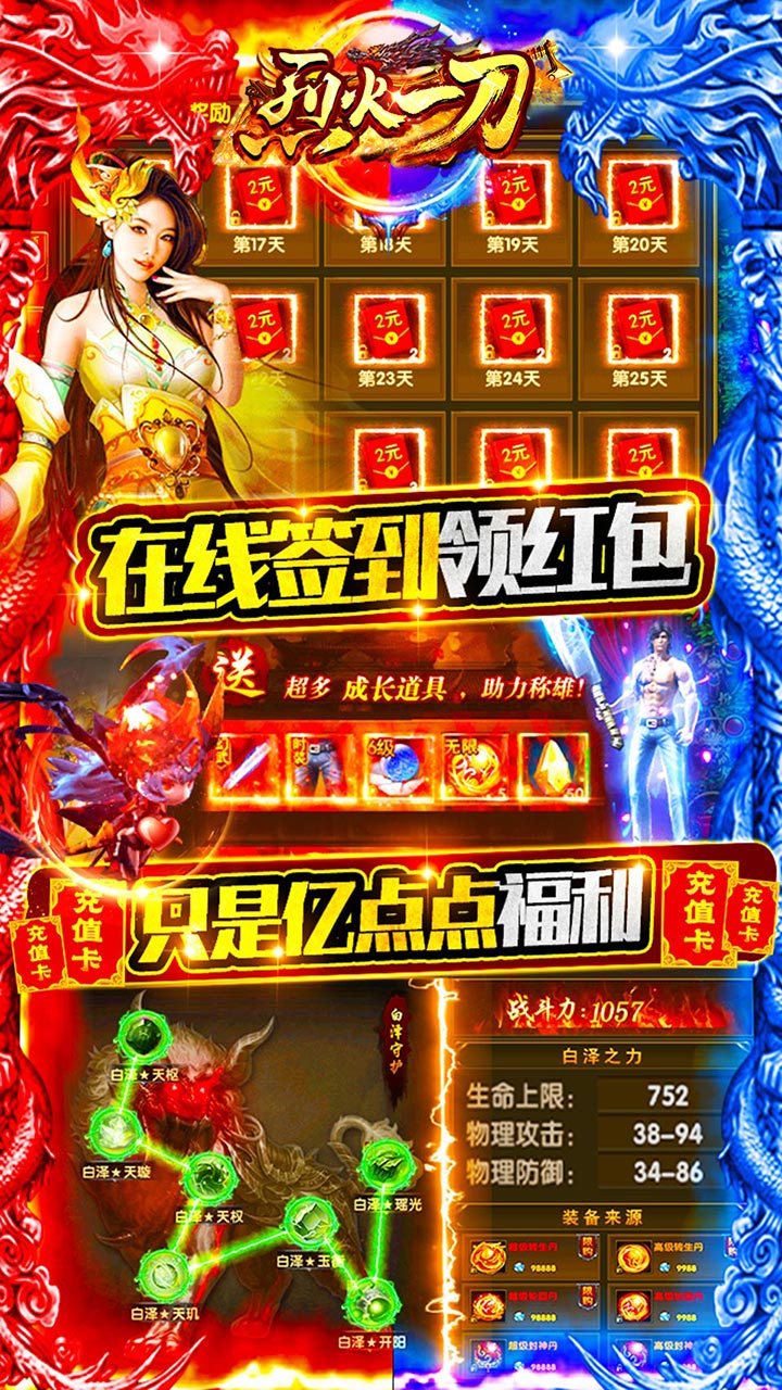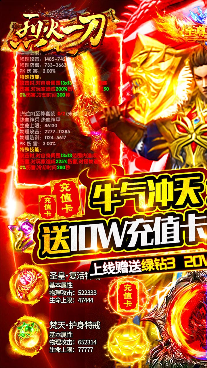 1、充值比例1:1000,首充3倍,部分档位可享受3次首充3倍 2、上线送绿钻3,20W钻石,1000W元宝,称号“刀刀切割,只只高爆”,10W充值卡 3、牛气冲天,金牛献瑞,爆十万充值助你牛转乾坤 4、在线签到领红包,只是亿点点福利 5、个性时装免费体验,豪华车库,应有应有,晒出不一样的风采 6、每天登录领豪礼,技能直升丹、影翼特效,领你所需 7、多档位豪华首充大礼包,传说萌宠、炫酷时装、神器特戒等你来拿 8、贵族、王者、至尊特权卡,三卡在手,福利领不完,三卡团购更划算哦