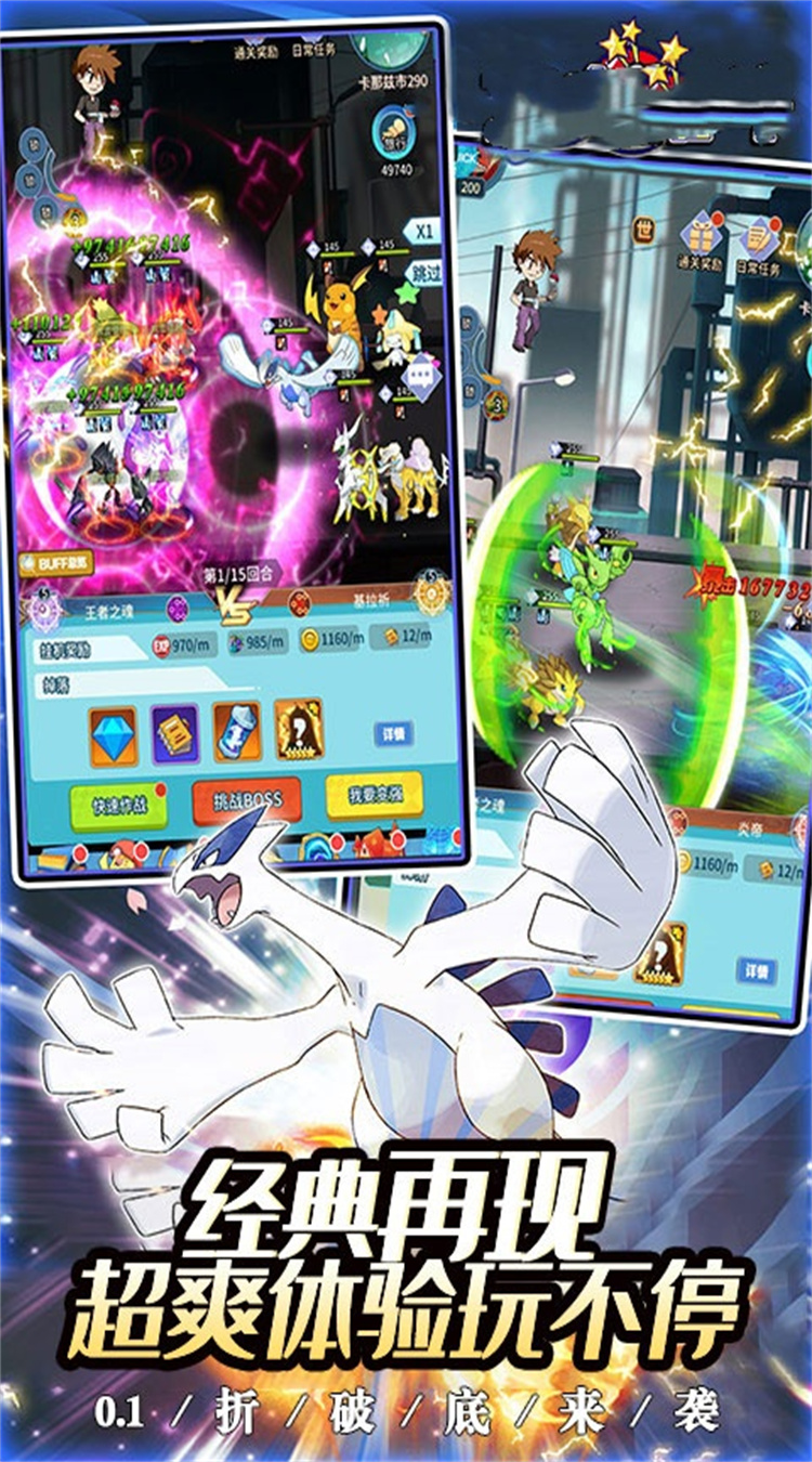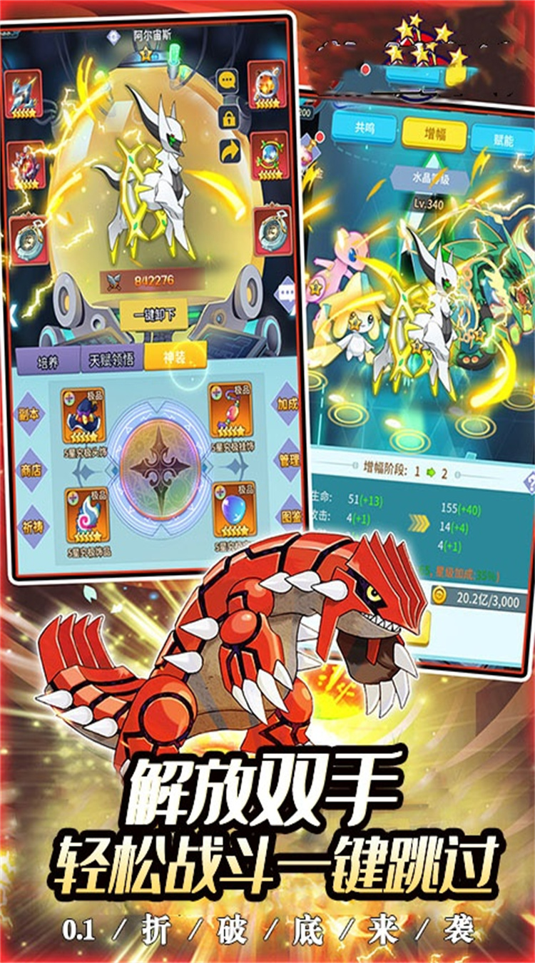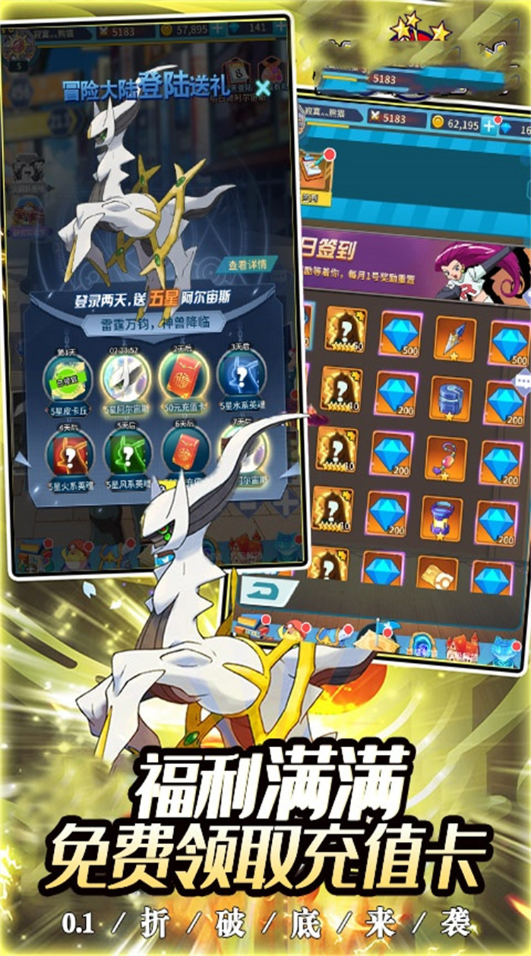 1、精灵放置卡牌手游,充值0.1折享土豪体验! ⒉、登录第二天送阿尔宙斯,第三天送50元红包,第七天送500元红包! 3、多种精灵任意搭配构建专属阵容!