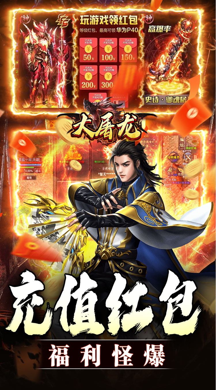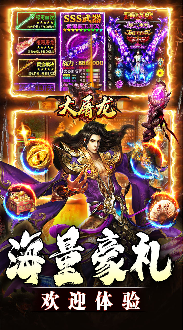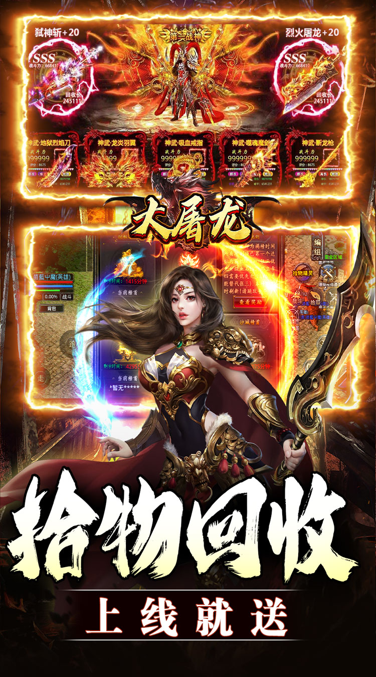 1、上线就送:自动回收、范围拾取、超大背包和仓库 2、上线就送:氵满屏特效、万亿切割、砍怪砍人炫炫炫炫炫 3、上线就送:商百万首爆、大量红包全服狂送送不停 4、PK超激情、流畅、超爽、人人可打终极,白大佬能毕业 5、砍怪个个有红包,刀刀砍米将白嫖进行到底