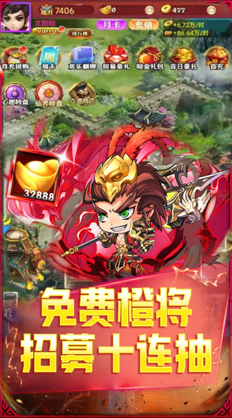 登录即送1.88万元宝、金币188.88万、称号【初露峥嵘】、武将10连抽