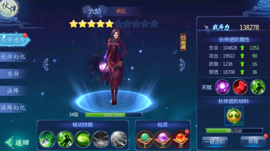 4、转职:目前最高为六转,达到对应转生等级以后会解锁对应的装备阶数和可以激活的伙伴法宝。