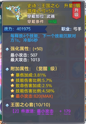 TIPS:在提升装备等级时,可以优先提升增加攻击力的装备,优先度:武器>戒指=项链>宝珠>衣服>头盔>圣物=手腕>腰带=鞋子。