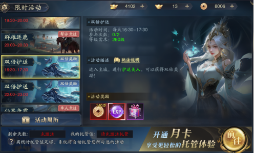 等级作为逍遥九歌行中最重要的一项数值,它关乎着各种玩法的解锁以及主线的推进,更高奖励副本的开启等等都需要达到一定的等级才能解锁开放。因此如何让前期刚入坑时经验最大化就显得格外重要。前期我们获取经验的途径主要为主线,经验副本,护送,悬赏任务,野外刷怪,天神试炼。而前期经验副本,以及护送,悬赏,试炼是重中之重。护送任务需要等到16;30-17;30期间有双倍再进行护送任务达到最大化,悬赏以及经验副本开启前先使用经验翻倍卷轴,增加获取的经验。这样就能很好的缓解前期卡级的问题。