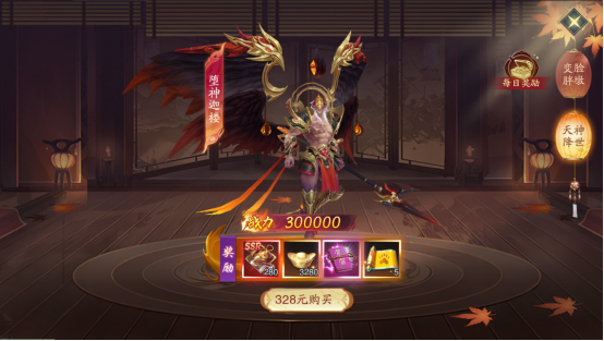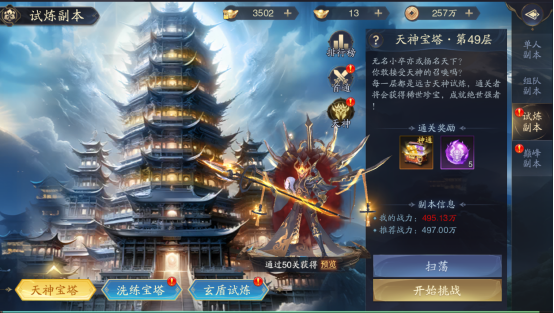 天神是本款游戏pve最重要的一个玩法,天神能够给我们带来海量战力,不仅如此,在pve时我们能够变身成天神,获得超额免伤以及超额攻击,帮助我们更加简单快速地击杀BOOS。天神的获取零氪主要是天神试炼以及天神宝塔,七日活动获取。天神宝塔主要产出进阶丹以及神通。
