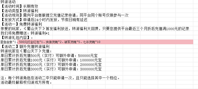 5、转游规则可能会做出调整,转游公告仅供参考,为了避免充值后无法获得转游福利,实际转游规则请咨询客服进行转游操作。