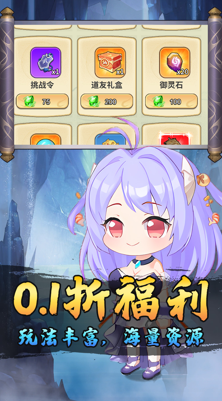 ★全场充值0.1折扣,充值比例1:10 ★进入游戏可以免费领取6480代金卷 ★签到福利:签到灵石材料领不停! ★超值终身卡:每日领取巨额元宝,激活一键扫荡特权轻松完成副本