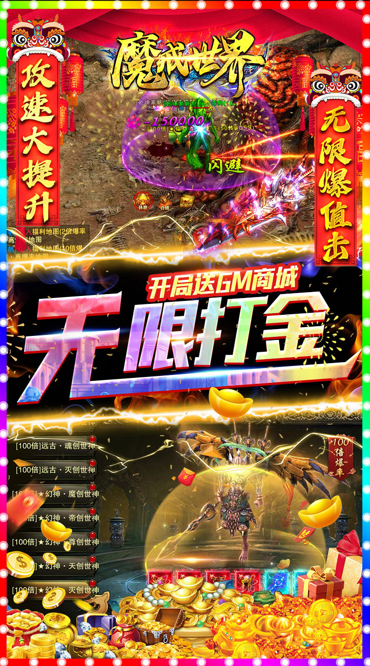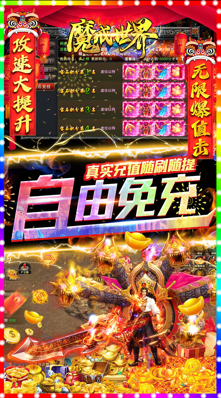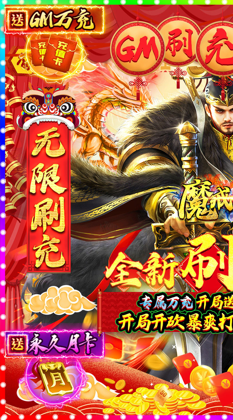 ★开局赠送满V+88万钻石+GM万元充值卡+20亿元宝+永久贵族月卡+屠神套 ★爆率大提升享,小怪打金掉无限充值,每日无上限! ★全新GM刷充打金系统,装备无限回收充值,每天打500W不是梦! ★小怪掉终极装备,不充值也能爽玩一整年 ★每天GM无限刷充,真实充值随刷随提,自由免充 ★专属万充开局送,特权充值全屏爆 ★小怪掉充散人天堂,无限打金