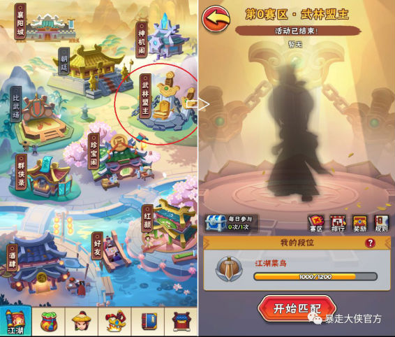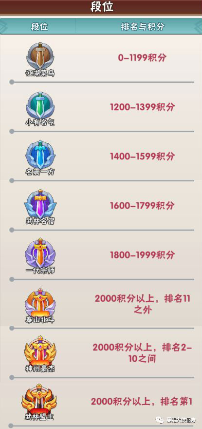 在战斗中取得更高的名次可以获得更多积分,通过累积积分来达到更高的段位。当积分达到2000分以上,前10名的玩家还会有相应的排名段位,二至十名的玩家为【神州豪杰】段位,位列第一的玩家,将会荣获【武林盟主】段位。