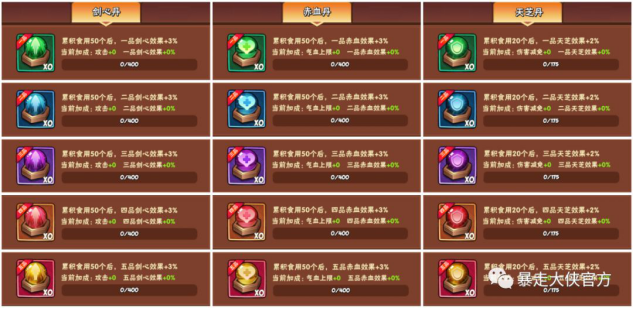 丹药分为三种,分别为剑心丹,增加攻击;赤血丹,增加气血上限;天芝丹,增加伤害减免。