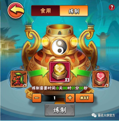 丹药系统内有食用和炼制两个功能。食用丹药可以增强人物属性,炼制则是获取丹药的途径。