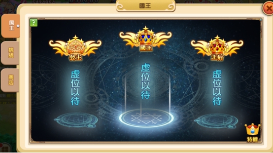 4.当爵位达到亲王时,挑战会升阶为“人气国王争夺战”5.“人气国王争夺战”初始人气为1000,达到亲王爵位的本服玩家会显示在界面左侧排行榜中