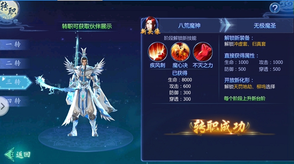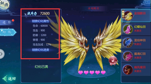 翅膀幻化:当翅膀幻化激活后,有多余的翅膀幻化激活卡都可以用来幻化升星哦,主要是百分比属性加成,和被动技能百分比属性加成,幻化进度越高,加成越高哦,所有幻化的翅膀属性都可以叠加的