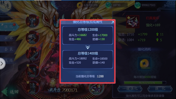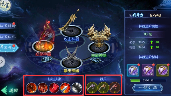 法灵培养:使用对应法灵材料进行升级法灵,其中破军法灵+2%总属性加成,最多加成+200%属性加成