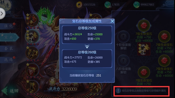 2.战力系统:宝石系统、套装系统、伙伴系统、法宝系统、神器系统、转职系统、坐骑系统、翅膀系统、境界系统、命星系统等,快速升级解锁后可以通过以上系统快速增加自身战力值