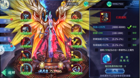 洗练属性:第一次洗炼开启第一条属性,花100绑定仙玉可解锁一条下面的属性,最多可解锁三条。花费洗炼石(洗炼石在剧情副本中可获得)可随机洗炼属性,可花费150仙玉洗炼不消耗材料且必出一条紫色或以上的属性,可锁定属性定向洗炼,每锁定一条洗炼所消耗的材料就翻倍