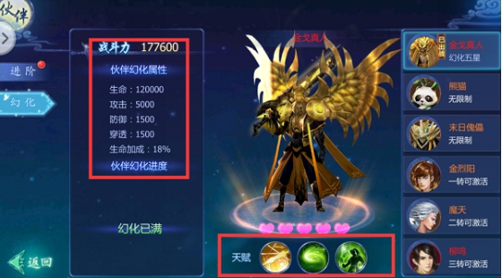 伙伴幻化:当伙伴幻化激活后,有多余的伙伴幻化激活卡都可以用来幻化升星哦,主要是百分比属性加成和被动技能百分比属性加成,幻化进度越高,加成越高哦,所有幻化的伙伴属性都可以叠加的