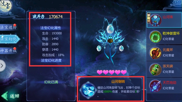 法宝幻化:当伙法宝化激活后,有多余的法宝幻化激活卡都可以用来幻化升星哦,主要是百分比属性加成,幻化进度越高,加成越高哦,所有幻化的法宝属性都可以叠加的