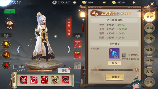 伙伴拥有3种灵丹,使用可额外增加伙伴属性,伙伴阶数越高,使用上限越高。