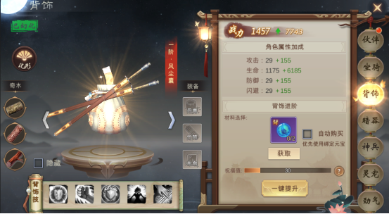 描述:背饰拥有炫酷的外观,并且能给与玩家大量的防御,可为主角增加大量的属性加成。是游戏中增高战斗力的重要途径之一。