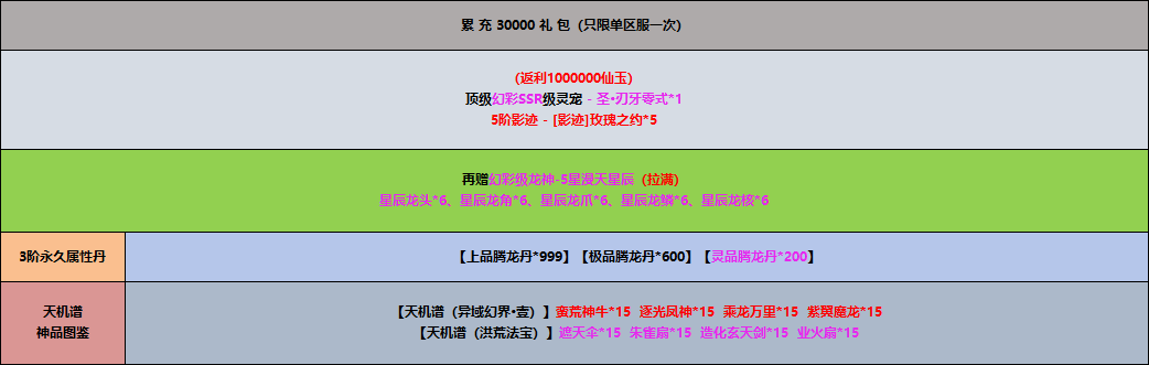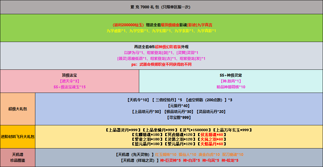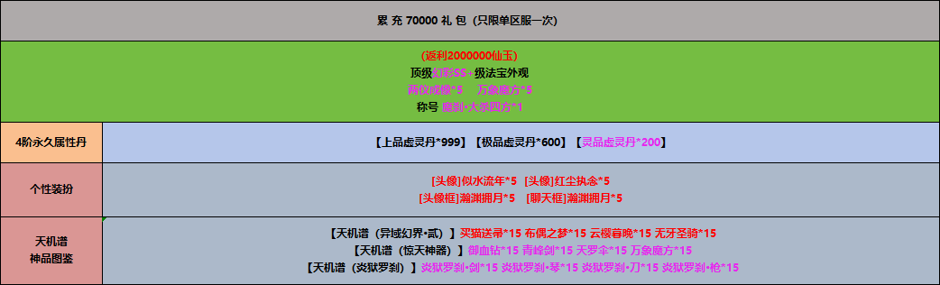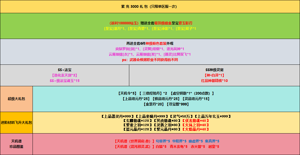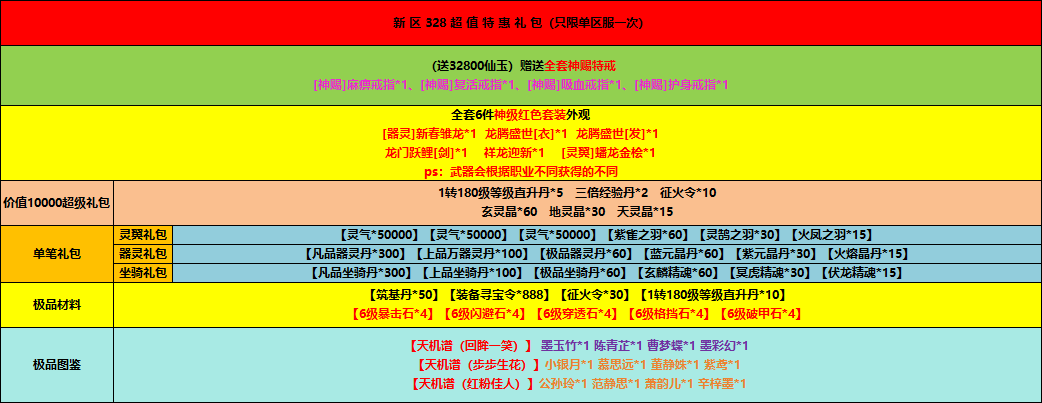 【豪华冠名】【称号】富可敌国、随机8级神恩宝石*3、寻宝图*30、随机中级属性丹*6、全服广播3次(每小时1次)