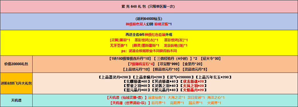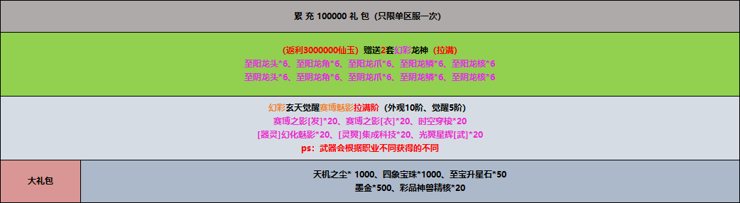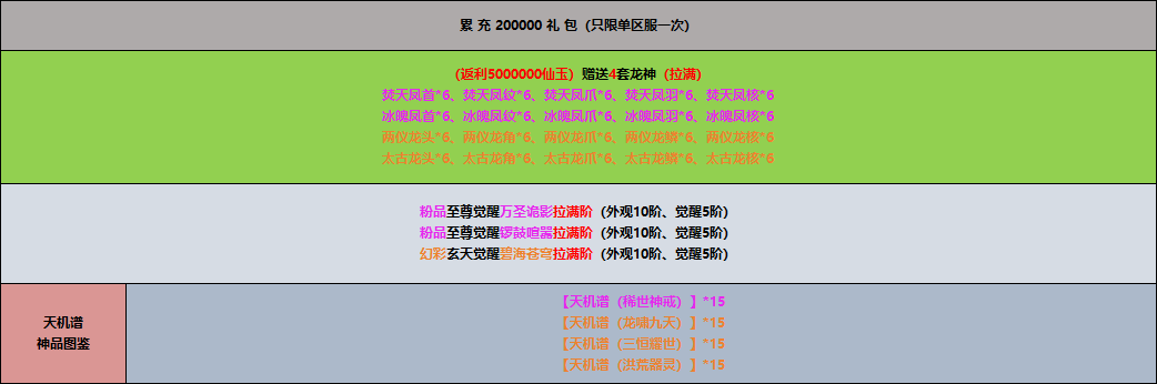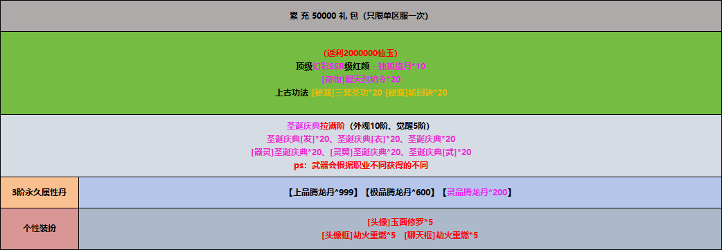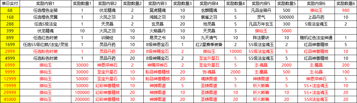 玩家每日累计实际支付RMB为准,可多项一起领取,如玩家单日实际支付50000元即可领取全部奖励