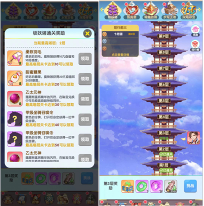 人物等级达到20级开启锁妖塔试炼玩法,这是获取大量前期资源途径,锁妖塔试炼主要获得宝玉和技能材料,通关还可以获得元神召唤和坐骑召唤令,其中还包含圣级和神级坐骑,千万别错过!
