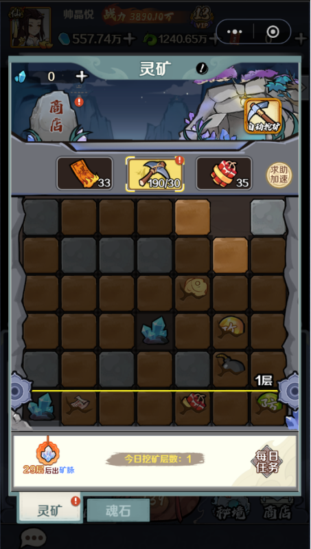 完成一定的任务后可以解锁灵矿探险功能,并获得30个矿锄,功能解锁后一定要第一时间去将矿锄消耗一部分,因为矿锄会随着时间回复,满了就恢复不了了,通过消耗矿锄挖矿我们也可以获得很多小鱼干,不喜欢挖矿的仙友还可以使用一键挖矿功能瞬间挖到大量奖励
