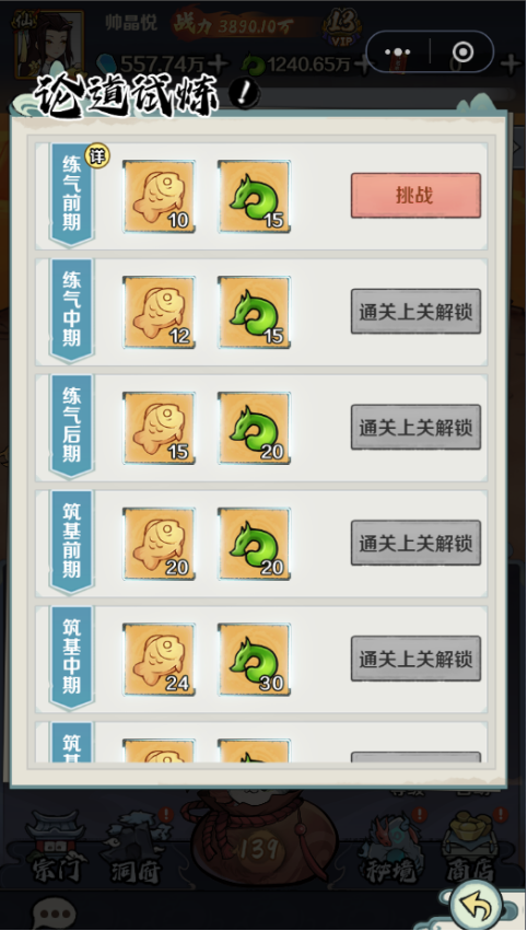完成一定的任务后可以解锁论道试炼功能,论道试炼分为挑战和扫荡,挑战不消耗次数,打得过就打,一直挑战