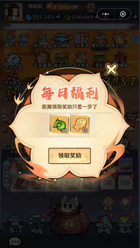 每在线一定时间会在主界面弹出一个飘荡的红包,点击就可以领取每日福利,每天可以领取5次,每次可以领取30仙玉+10个小鱼干,不要忘记领取哦!