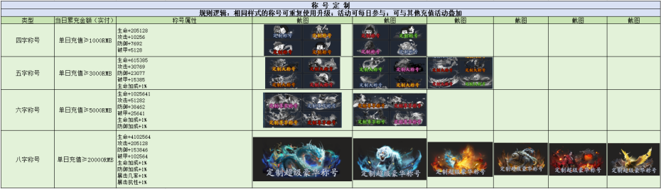 2、提供4个挡位称号模板任选,不同模板可定制字数不同,相同样式的称号可重复使用升级。