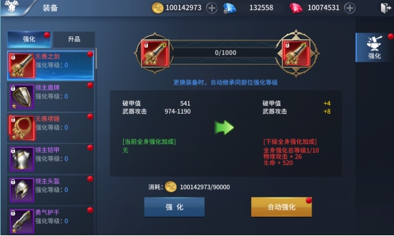 (1)、强化功能:强化装备能提升装备的各种属性,达到经验值既可以强化成功,也会消耗一定游戏币。