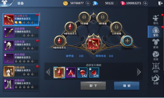 (2)镶嵌功能:在装备界面可以切换到镶嵌界面,镶嵌界面显示你目前镶嵌宝石的状态和背包所拥有的宝石。提升镶嵌的宝石等级,战力会随之提升。每件装备有4个孔位可镶嵌宝石,每个孔位开启的条件不同