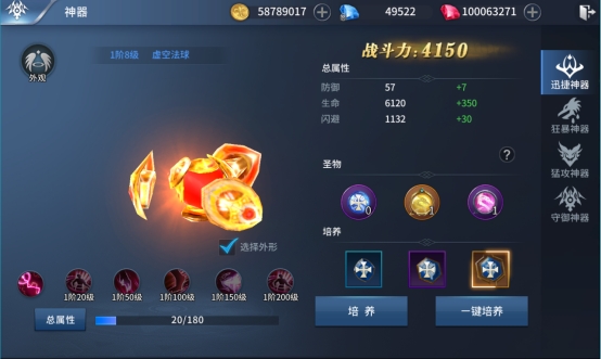 神器系统是为角色战斗力,属性加成的重要一环。神器有4个,每个可以单独升级,单独拥有技能,指定等级开启指定技能,级别越高,属性、战力加成越高。