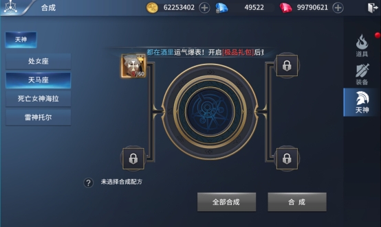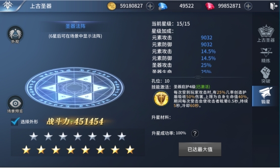(4)锻星:上古圣器附带的法阵系统,通过锻星来提高圣器法阵的星级,从而获得属性加成已经激活特殊的法阵光环技能。