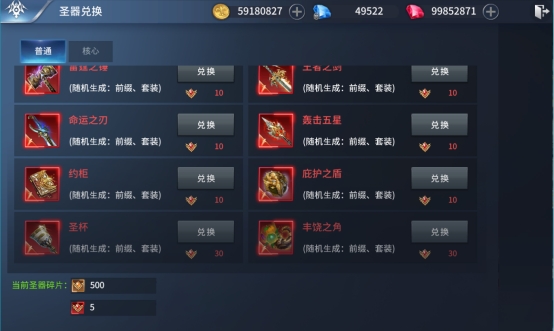 (5)兑换:玩家可以分解不需要的圣器,将获得的圣器碎片兑换自己想要的圣器。