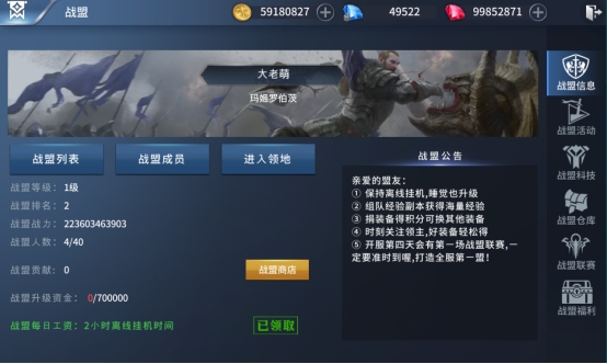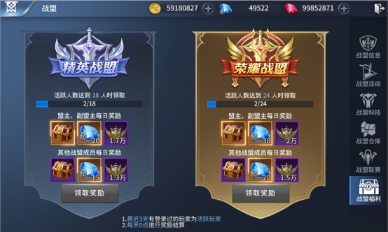 (6)战盟福利:根据前一天战盟的活跃人数的情况,所有战盟成员都可以领取一份丰厚的奖励。