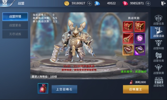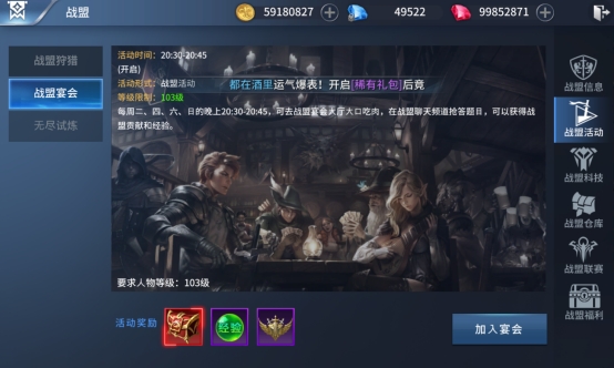 (2)战盟活动:战盟活动有3种,分别是:战盟狩猎,战盟宴会,无尽试炼。
