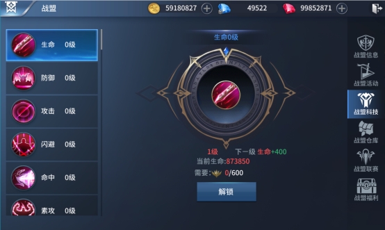 (3)战盟科技:玩家可以消耗战盟贡献提升战盟科技的等级,从而提高自身的能力值。