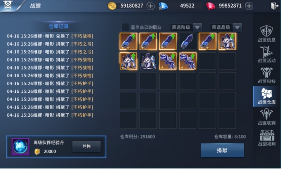 (4)战盟仓库:玩家可以将不需要的装备捐入战盟仓库来获得仓库积分,也可以消耗仓库积分从战盟仓库中兑换自己需要的装备。